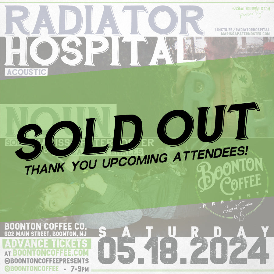Radiator Hospital is best known as the music vehicle of singer-songwriter & Michigan-turned-Philadelphia transplant, Sam-Cook Parrott. A writer of often hazy, yet equally adhesive, pop poetry which lay like a soft blanket across fuzzed out, whatever-fi acoustic/electric guitars and eclectic accompaniments. Radiator Hospital has a sound made for DIY basements, living room shows and couch sesssions, while endearingly catching a ride atop their swarms of fans on a decade plus ascent into fervent rock clubs. Sam-Cook Parrott joins Boonton Coffee Presents to showcase a night of acoustic songs and we couldn't be more psyched to have him on this double bill. Radiator Hospital released two albums in 2023, a self-released EP called Watching a Fire, as well as the full-length, Can't Make Any Promises via Salinas Records.